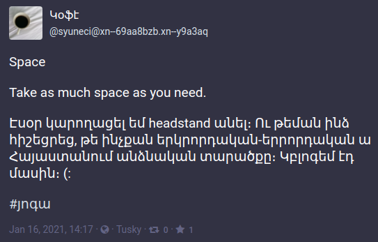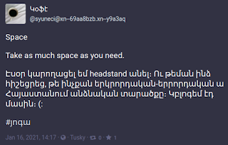որոշեցի տարին սկսել ամբողջական, համակարգված մի շարքով, որի ամեն օրը մի խորագիր ունի։ թութում գրում եմ ամեն օրվա խորագիրն ու մեկ֊մեկ էլ կիսվում եմ փոքրիկ հաջողություններով։ ու իսկապես ուրախանում եմ, որ թութեցիները հետաքրքրվում են (I could sound biased բայց թութը էն քիչ տեղերիցա, որ գրում ես ոչ թե ձևական, այլ քննարկելու համար ու մարդիկ միշտ խոսում են քեզ հետ, միշտ ունեն պատմություններ, հարցեր)։ երեկվա խորագիրն էր՝ space: